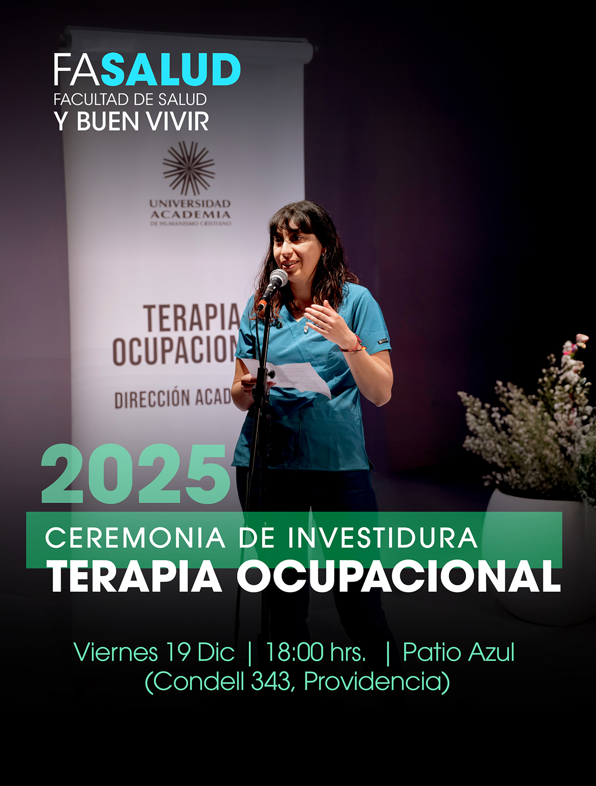 La carrera de Terapia Ocupacional de la Universidad Academia de Humanismo Cristiano llevará a cabo su Ceremonia de Investidura 2025 el viernes 19 de diciembre a las 18:00 horas en el Patio Azul (Condell 343, Providencia).