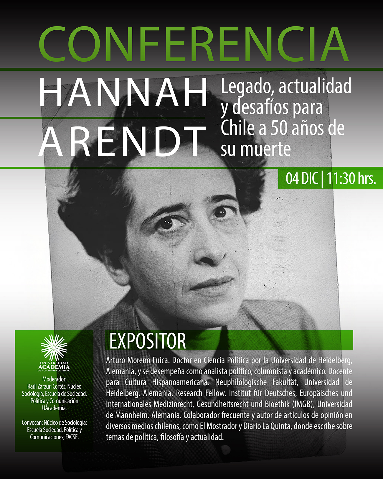 Para esto el Dr. Arturo Moreno Fuica, profesor de la universidad de Heidelberg, dictará la charla “Hannah Arendt y la política: legado, actualidad y desafíos para Chile a 50 años de su muerte”.