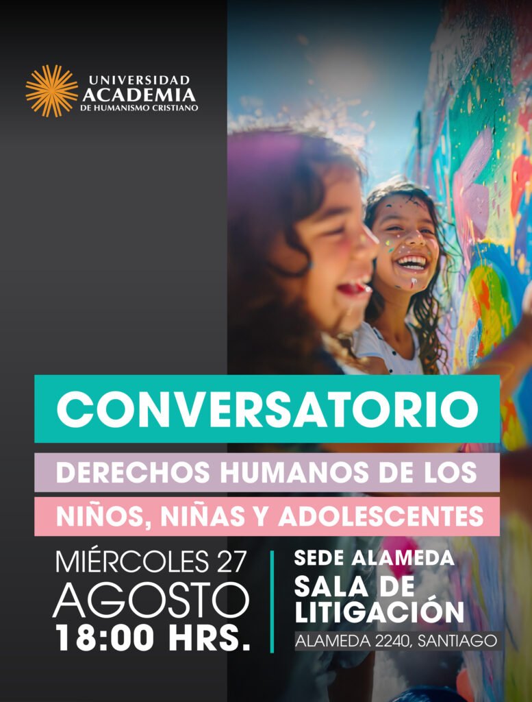 La Escuela de Derecho UAcademia invita al “Conversatorio sobre derechos humanos de los niños, niñas y adolescentes” que se realizará el miércoles 27 de agosto a las 18:00 horas en la Sala de Litigación de la Sede Alameda (Alameda 2240, Santiago).