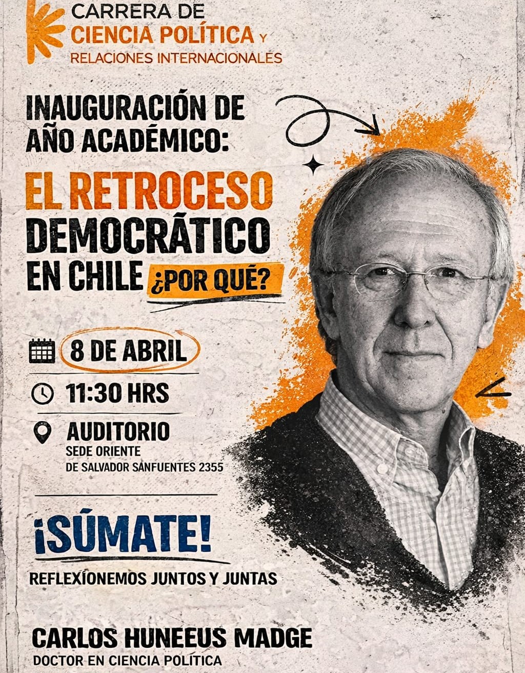 En el marco de la Inauguración del Año Académico 2026 de la carrera de Ciencia Política y Relaciones Internacionales de la Universidad Academia de Humanismo Cristiano, el doctor en Ciencia Política Carlos Huneeus Madge dictará la charla “El Retroceso Democrático En Chile Por Qué?”. La actividad se realizará el miércoles 8 de abril a las 11.30 horas en el Auditorio de Salvador Sanfuentes 2355 (Sede Oriente).