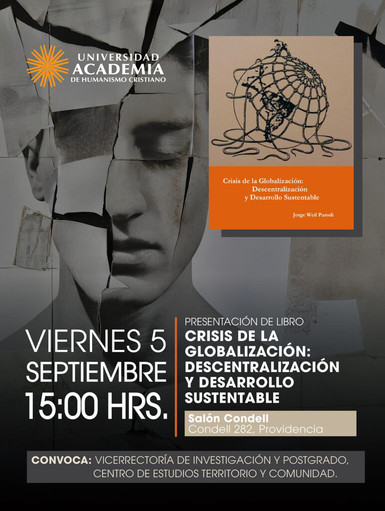 La Vicerrectoría de Investigación y Postgrado de la Universidad Academia de Humanismo Cristiano y el Centro de Estudios Territorio y Comunidad invitan a la presentación del libro “Crisis de la globalización: Descentralización y Desarrollo Sustentable” del Dr. Jorge Weil Parodi. La actividad se realizará el viernes 5 de septiembre a las 15:00 horas en el Salón de Condell 282, Providencia.