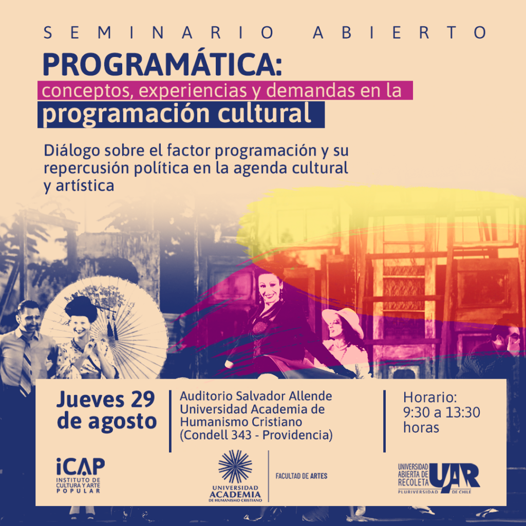 La Facultad de Artes de la Universidad Academia de Humanismo Cristiano y el Instituto de Cultura y Arte Popular (ICAP) de la Universidad Abierta de Recoleta realizarán el próximo jueves 29 de agosto el seminario Programática: conceptos, experiencias y demandas en la programación cultural.