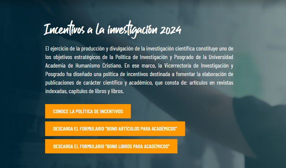 La Vicerrectoría de Investigación y Posgrado ha diseñado una política de incentivos destinada a fomentar la elaboración de publicaciones de carácter científico y académico, que consta de artículos en revistas indexadas, capítulos de libros y libros.